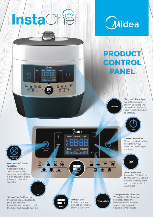 مولتی کوکر MY-SS6062 میدیا با دکمه Start شروع به کار کرده و دکمه Cancle به کار آن خاتمه می دهد و دارای 4 عمل کاربردی زودپز، آرامپز، پلوپز و بخارپز است. به طور کلی تعداد برنامه پخت این دستگاه 14 عدد می باشد که امکان سرخ کردن، پخت گوشت، ماهی، تهیه ماست، دسر، برنج، نان، پاستا، سبزیجات، کیک و… را به شما می دهد. شما می توانید با دکمه Menu که به صورت ولومی شکل روی دستگاه تعبیه شده آن را روی برنامه مورد نظر خود قرار دهید. گزینه Bake موجود روی دستگاه گرمای داخل آن را یکنواخت کرده و می توان گفت کار فر را برای شما انجام می دهد. به وسیله قابلیت های MY-SS6062 شما می توانید غذاهای متنوعی با این محصول تهیه کنید. همچنین شما می توانید زمان پخت غذا را تا 24 ساعت به تعویق بی اندازید که به وسیله دکمه مثبت (+) زمان را بیشتر و با دکمه منفی (-) زمان را کمتر کنید. این ویژگی دستگاه MY-SS6062 بسیار مناسب برای افراد شاغل می باشد چرا که شما با تنظیم آن روی زمان دلخواه تان می توانید در حین انجام کارهای روزمره از پخته شدن غذای خود نیز اطمینان حاصل کنید. زودپز MY-SS6062 دارای قابلیت گرم نگه دارنده (Keep Warm) نیز می باشد که سبب می شود به کمک آن غذای شما پس از آماده شدن، تا چند دقیقه گرم بماند. از دیگر قابلیت های انعطاف پذیر این دستگاه چند کاره، می توان به تنظیم سطح دمای پخت دستگاه MY-SS6062 نیز اشاره کرد که به وسیله دکمه Level در سه حالت کم، متوسط و زیاد قابل تنظیم است. با گزینه Cooking Timer هم می توانید زمان کلی پخت غذا را تعیین کنید. تمام تنظیمات و برنامه های ورودی ای که به دستگاه می دهید از طریق صفحه نمایش دیجیتالی و LED موجود روی دستگاه قابل رؤیت می باشد.