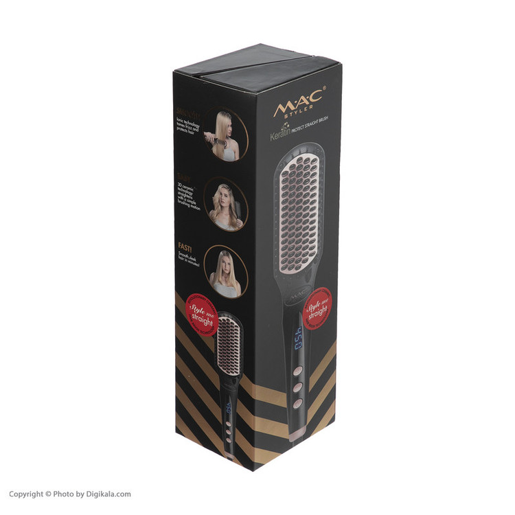برس حرارتی مو مک استایلر مدل MC-19 دارای دندانههایی است که داغ میشوند و موها را صاف میکنند. هنگام شانهکردن، موها از میان دندانهها عبور کرده و در تماس با سطح داغ قسمتهای سرامیکی صاف میشوند. سرامیک ضمن اینکه حرارت را به شکل یکنواخت پخش میکند، از موها محافظت بیشتری به عمل میآورد. صافکردن موها با برس حرارتی سریع و راحت است و کسانی که موهای بلند و متوسطی دارند، میتوانند از این روش برای صافکردن موهای خود استفاده کنند. از این برس می توان بعد از استحمام استفادهکرد. برس حرارتی مو مک استایلر مدل MC-19 دارای سیستم خاموشی خودکار بوده و قابلیت تنظیم دما دارد. گفتنی است مدت زمان گرم شدن این محصول بسیار کوتاه و تنها 30 ثانیه است. از ویژگیهای این محصول میتوان به قابلیت تولید یون، دارای سدیم با قابلیت چرخش 360 درجه و توان دستگاه برابر 50 ولت اشاره کرد.