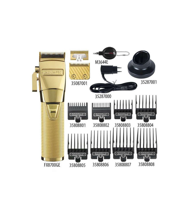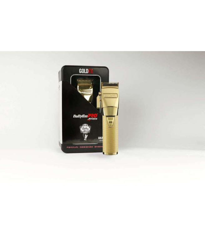 ماشین اصلاح سر و صورت بابیلیس پرو گلد اف ایکس BaByliss FX870G PRO GOLDFX Clipper دارای طراحی منحصر بفرد و بسیار زیبایی است .این مدل یک باتری لیتیومی قدرتمند دارد که اصلاحی بی نظیر را به مدت 2 ساعت بعد از شارژ کامل برای شما فراهم میکند .دستگاه بابیلیس گلد بی سیم بوده و دارای 2 ولتاژ شارژ متفاوت است .طراحی بدنه و موتور این مدل از روی فراری بوده و زیبایی و کارایی را یکجا دارد .تیغه آن قابل تعویض بوده و دارای پوشش تیتانیوم است .علاوه بر اینها دارای 5 حالت کنترل است .داخل بسته بندی بابیلیس گلد 8 عدد شانه برای انواع سایز اصلاح در نظر گرفته شده است .تمام اجزای به کار رفته در این مدل حتی گیره آویز ماشین اصلاح همه از جنس فلز می باشد .این مدل از سری محصولات فلزی برند بابیلیس ،طرفداران بسیار زیادی در سراسر دنیا دارد .